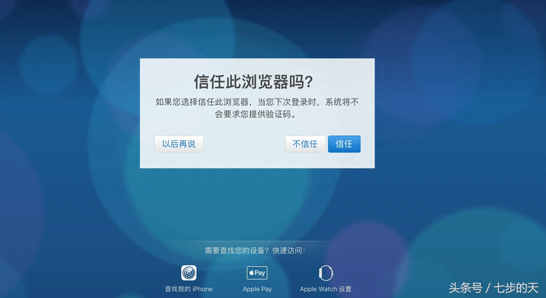 8、输入正确的验证码之后icloud邮箱登录网页版,在第一次在浏览器上面登录的时候。为了安全,会问是否信任,可以选择“以后再说”。如图