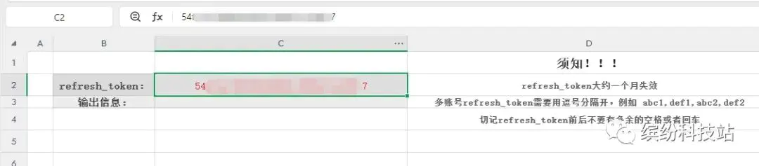 打开另存的在线文档副本,在【C2】单元格输入refresh_token值