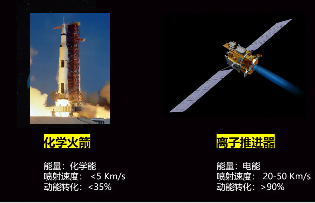 化学火箭与离子推进器的性能比较,左为“土星5号”运载火箭,右为使用离子推进器的“深空一号”航天器