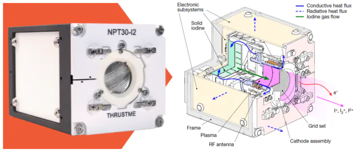 ThrustMe公司开发的碘电推进器NPT30-I2的外观(图片来源:)和内部结构(图片来源:参考文献[8])