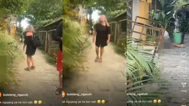 在Instagram账号@buleleng_ngacuh分享的这段视频中,这名男子穿着黑色短裤和白色人字拖,懒洋洋地躺在一所房子前的地上。可以看到一个穿着白色裙子的女人骑在这个男人身上,看起来真的很令人难受。