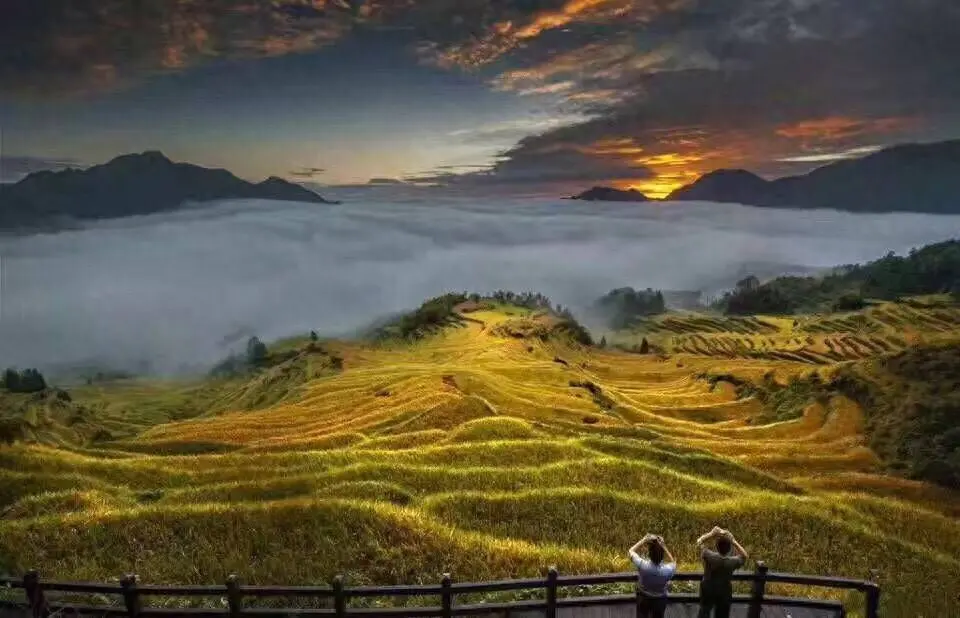 晨曦时的云海奇观,梯田和旁边的村庄云海的覆盖下,若隐若现,宛如置身缥缈仙境。中午天晴的时候,坝达、多依树观景点梯田在蓝天白云映衬下,五光十色,清风吹拂,波光粼粼。而日落时的老虎嘴观景点梯田在落日映照下如诗如画,让人生不出夕阳无限好只是近黄昏的感叹。