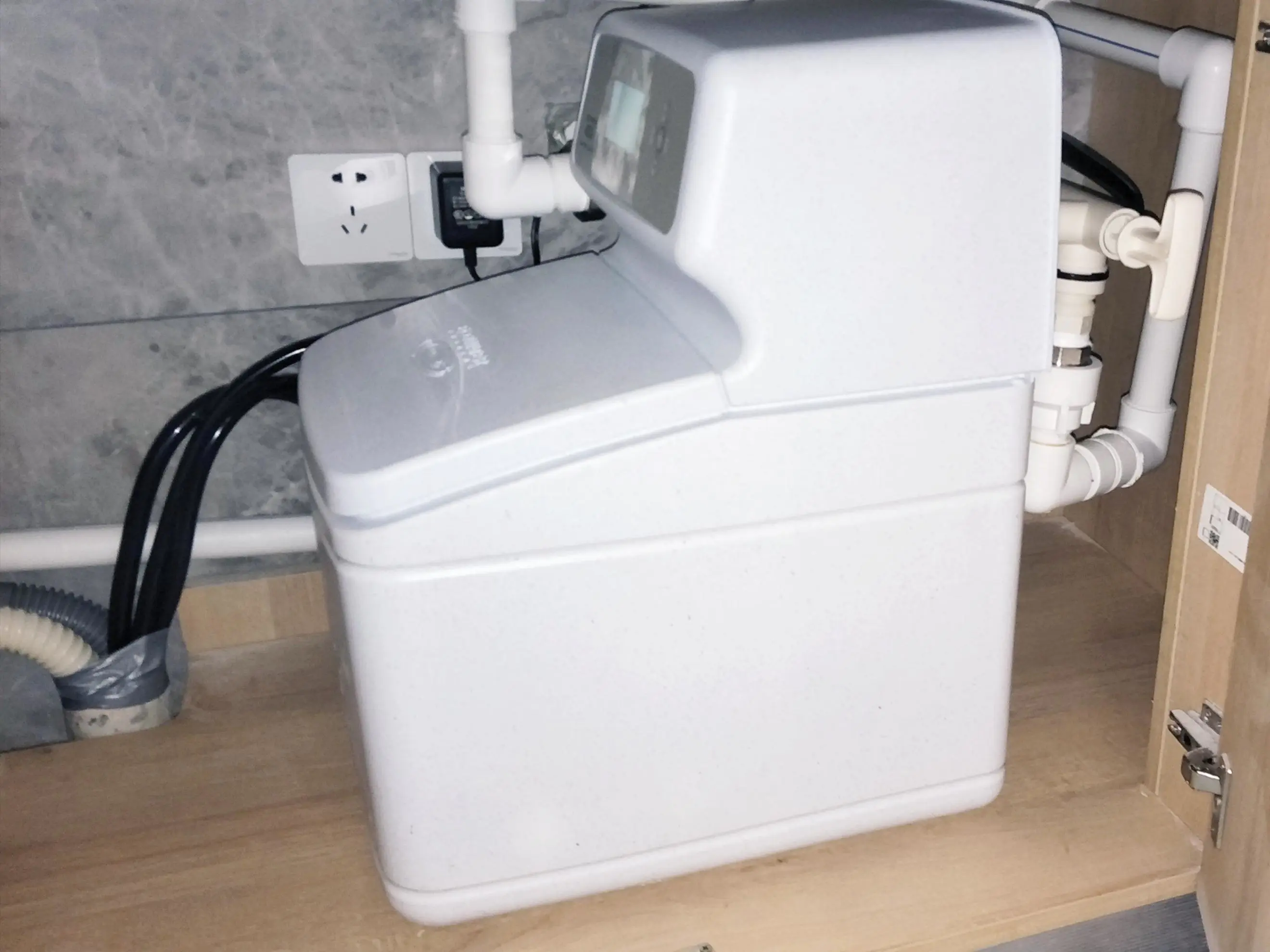 自来水管道,正常接到厨房水槽上。再从水槽下面一分为二,一根接到卫生间水龙头,另一根接到软水机上。之后再从软水机的出口引出,分别通往洗衣机水龙头、热水器进水口。