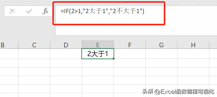 举个例子,公式:=IF(2>1,”2大于1″,”2不大于1″)