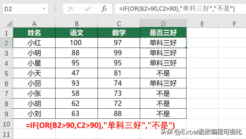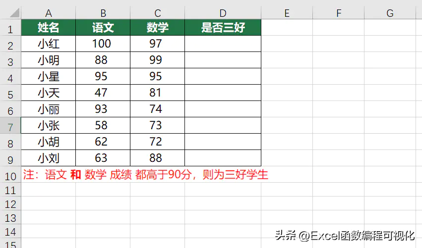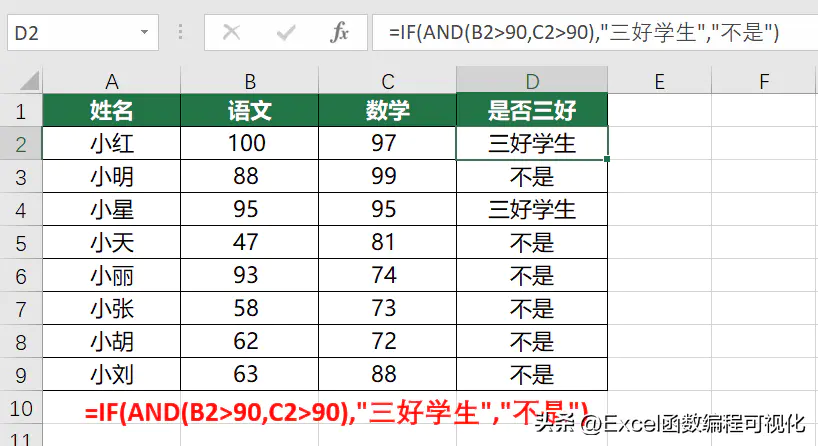 如下图中,如果要判断是否为三好学生,需要同时判断语文和数学成绩,这样就涉及到了2个单元格的判断。