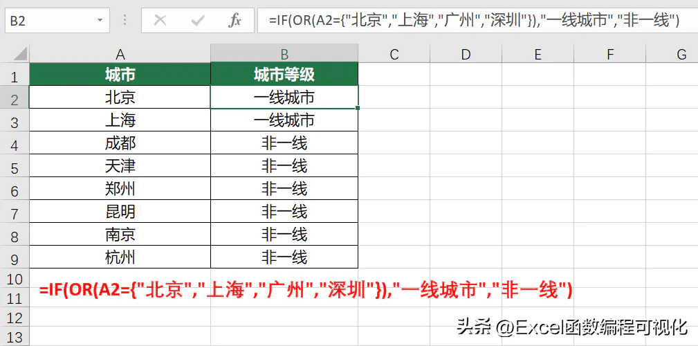这里我们利用花括号{}构建一个集合,只要A列城市等于集合中任何一个城市则返回一线城市,这里的OR函数起到了或的作用。