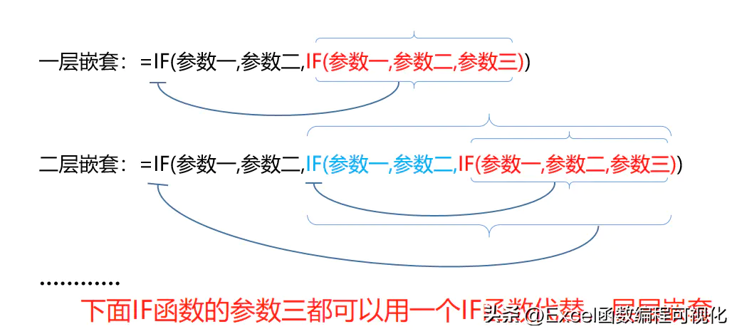 二层嵌套中,红色部分+蓝色部分组成第一个IF函数的第三个参数,红色部分组成了第二个IF函数的参数三。