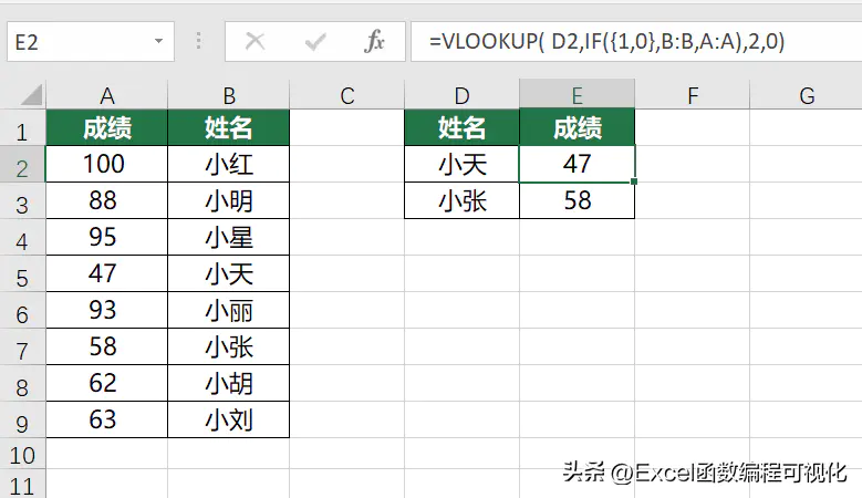 下图中,通过A-B列的数据匹配D列人员的成绩,VLOOKUP正常用法是无法实现的,因为VLOOKUP的参数二(搜索区域)的首列必须是姓名列,而下列的数据源姓名列位于成绩列后方。