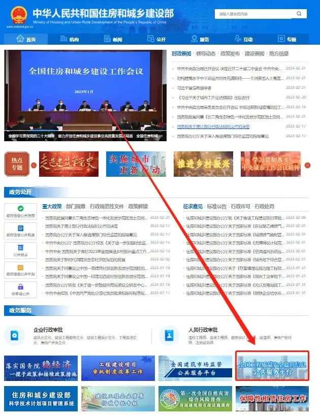 各省、自治区、直辖市建设主管部门官方网站可通过“中华人民共和国住房和城乡建设部”官方网站:,在网站首页左下角找到“全国工程质量安全监管信息平台公共服务门户”一栏点击进入或者通过本文件所汇总的网站链接进行访问。