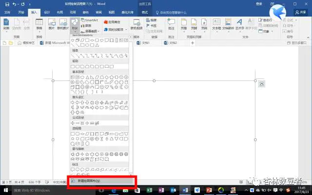1、打开Word文档窗口,切换到“功能区”。在“插入”分组中单击“形状”按钮,并在打开的菜单中选择“新建绘图画布”命令。