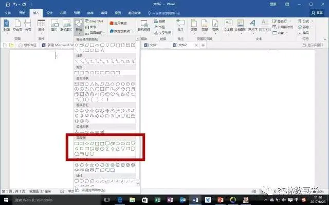 2、选中绘图画布,在“插入”功能区的“插图”分组中单击“形状”按钮,并在“流程图”类型中选择插入合适的流程图。