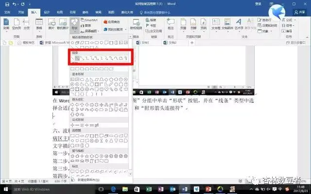 3、在Word2007“插入”功能区的“插图”分组中单击“形状”按钮,并在“线条”类型中选择合适的连接符,例如选择“直线箭头”和“连接符:肘形箭头”。