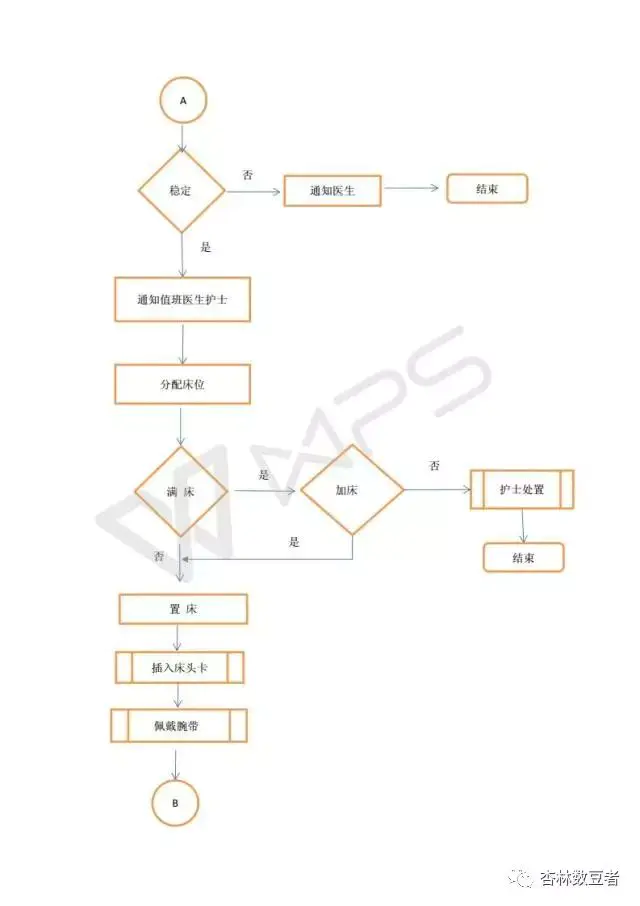 马老师布置的作业是绘制“病区接诊患者工作流程图”,这项工作用文字描述大致情形是: