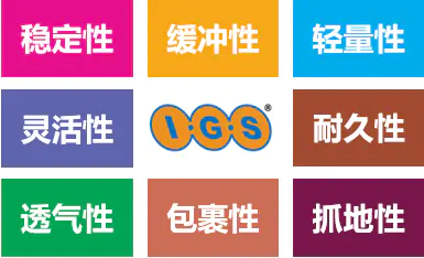 *图中词语为鞋子最基本的八大功能。当这些功平衡性达到最高水准时,就具有 IGS 标准