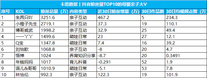 透过卡思数据,我们不妨先来看看标签为“母婴亲子”的垂类账号,粉丝量排名前10的账号都有谁?