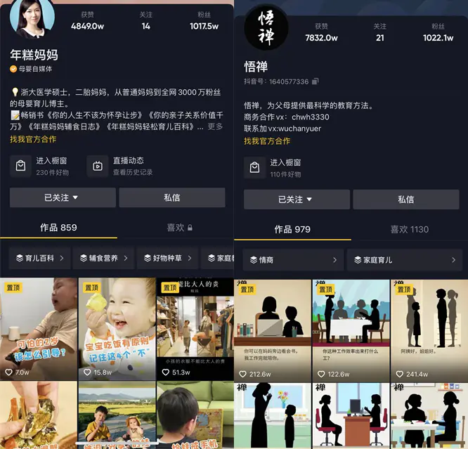 这样一来,留在榜上的账号,真正主打育儿科普知识分享的就只剩下@年糕妈妈和@悟禅了,而这两个账号无论是内容风格、调性,还是目标人群定位上都存在极大差异。