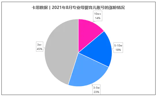 卡思特别盘点了8月涨粉最快、且细分标签为#母婴育儿(注:这里不含亲子互动、萌娃日常)的TOP1000账号,发现:仅有119个账号粉丝量过了百万,大量账号仍处于艰难“爬坡”阶段,而从他们的整体增粉势头来看,又有861个账号月增粉量不超过10万,这意味着:母婴育儿账号要实现从“尾部”向“腰部”的跨越,难度之大。