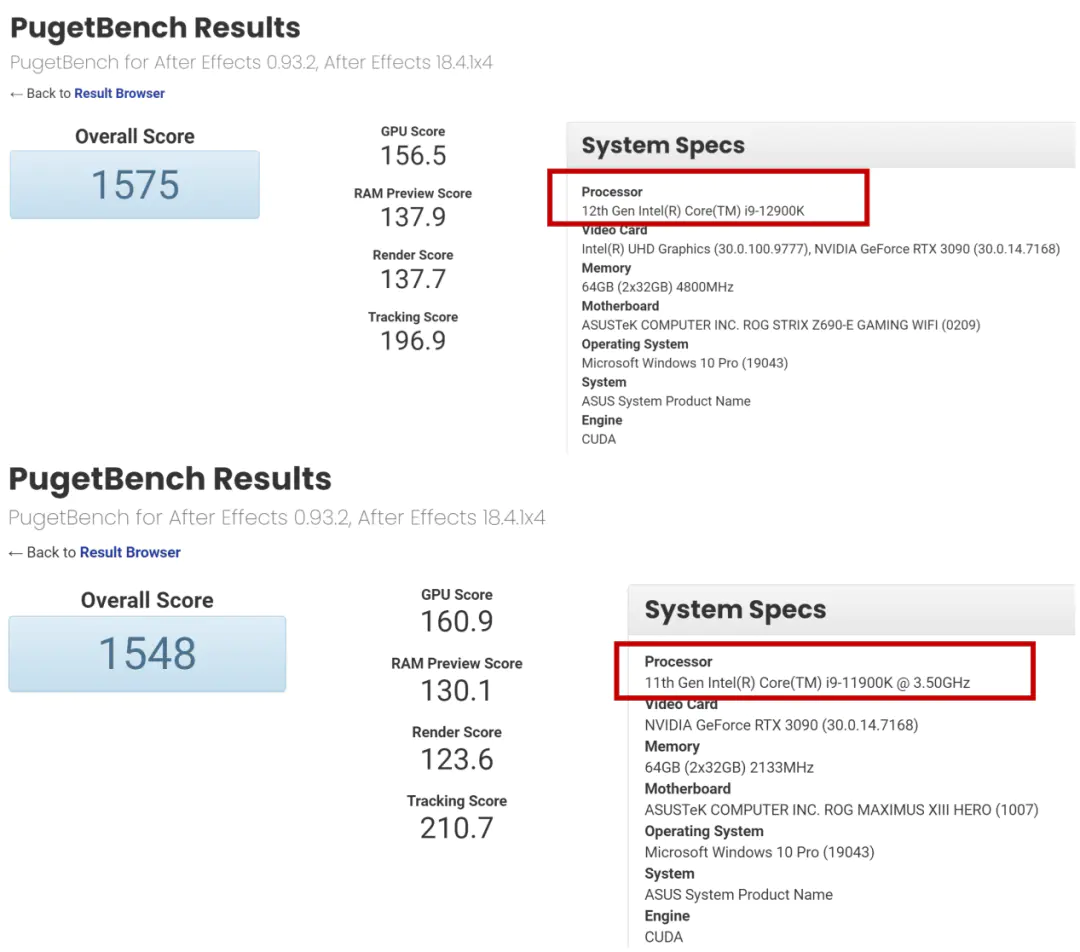 跑分方面,该处理器在Adobe After Effects的PugetBench基准测试中获得了1541、1573和1575的分数。对比酷睿i9-11900K平台1548分的成绩并没有太大的进步,不过需要注意的是,该测试是一项涉及GPU的基准测试,因此这一数据无法完全体现CPU的性能结果,但这已经是迄今为止发现的唯一结果。