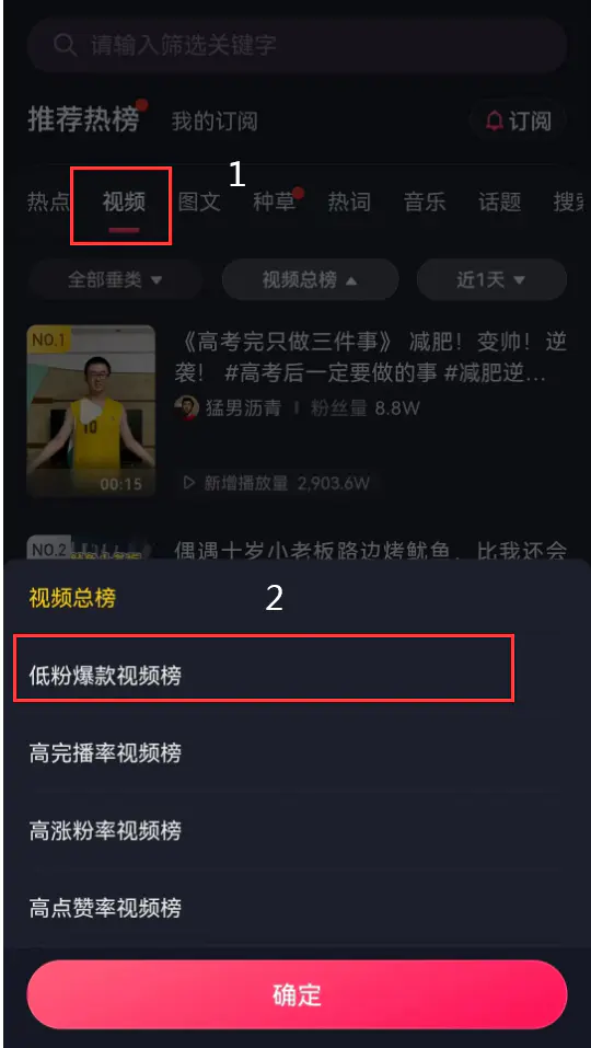 然后在这个类目选择下来后,在“视频总榜”那个选项里切换一下,换成“低粉爆款视频榜”,借鉴一下前10名的博主内容