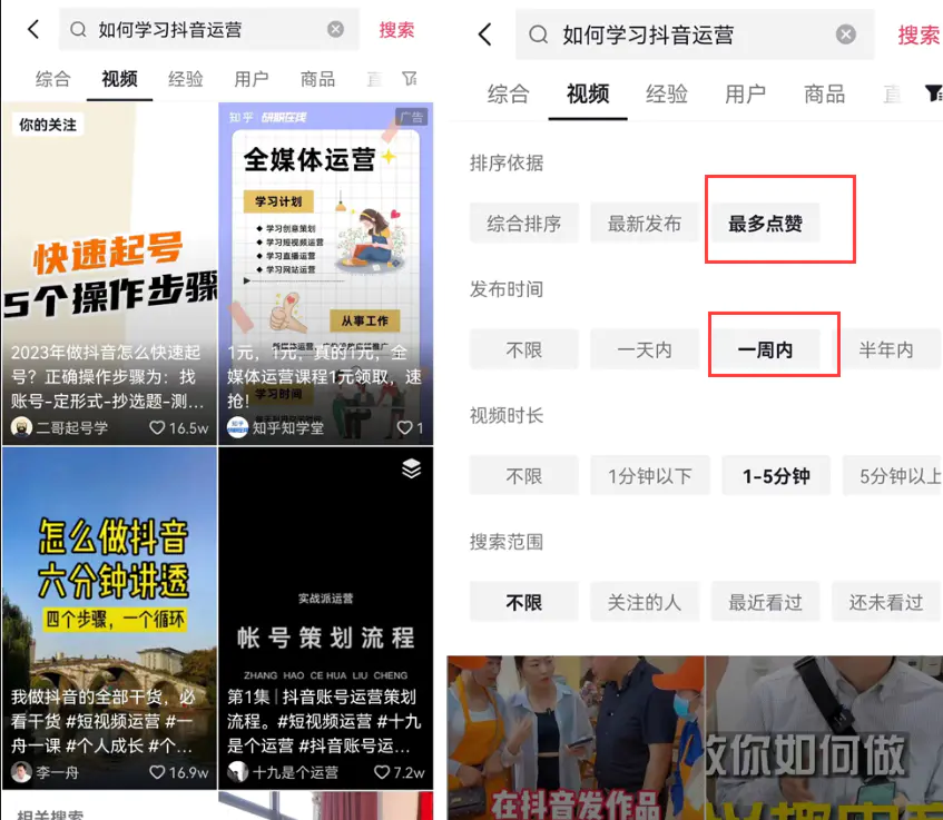 去看看你监测的那20个账号,最近发的最火,和你脑海里规划最相似的那个视频,标题复制一下,然后去抖音首页搜一下,然后筛选“最多点赞”,发布时间一周内就行了: