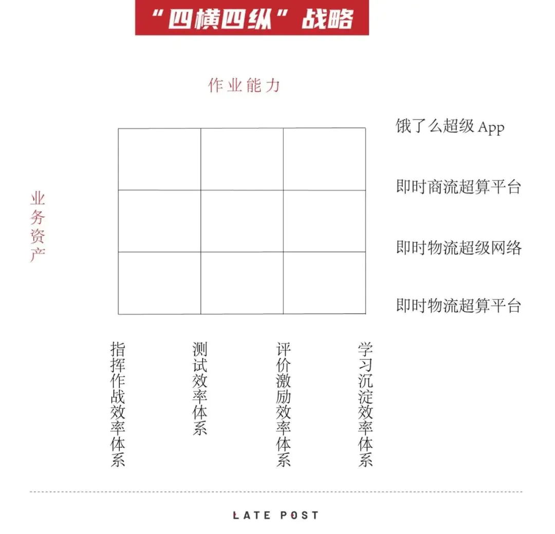 “四横” 指业务资产,包括饿了么超级 App、即时商流超算平台、即时物流超级网络(蜂鸟)、即时物流超算平台。“四纵” 指作业能力,包括指挥作战效率体系、测试效率体系、评价激励效率体系、学习沉淀效率体系。