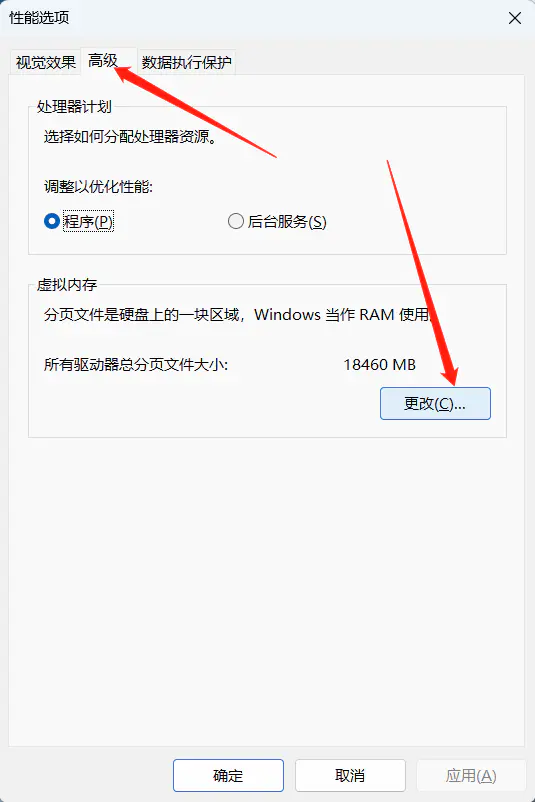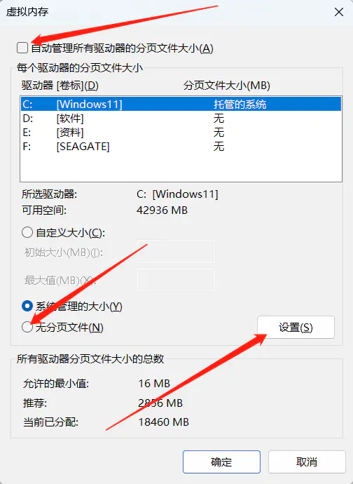 取消勾选“自动管理所有驱动器的分页文件大小”,然后选中C盘,选择“无分页文件”→设置