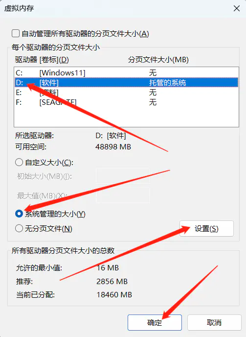 选择C盘以外剩余空间较大的盘(不要选移动硬盘),选中“系统管理的大小”→设置,最后点确定