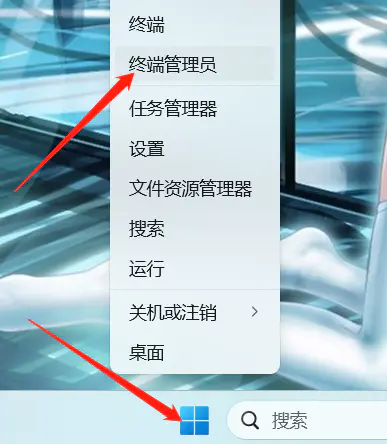 在开始菜单上点击鼠标右键,打开“终端管理员”