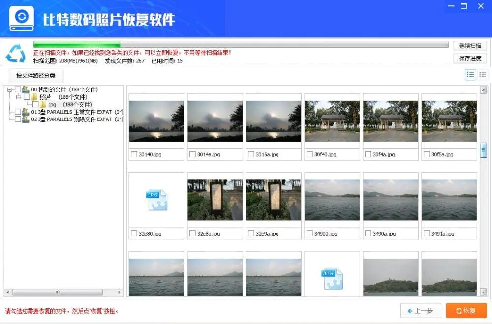 4、扫描完成后,界面会出现多个文件夹,里面就是被删除的照片。通过筛选之后,勾选需要恢复的照片。