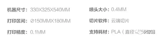机器的参数如下,喷头是常用的0.4mm,打印区间是直径150mm,高度180mm,这个尺寸不算大,不过考虑到定位,这个尺寸也还是够用了。切片是支持上传模型,云端切片的。