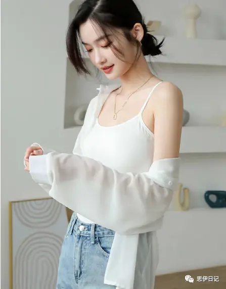 最为常见的搭配,简单的小吊带背心作为内搭,外配一款简约时尚防晒外衣,再搭配上一条休闲的阔腿裤,不需要其他的点缀,就能呈现出一种青春活力的美少女形象,为夏日增加一份甜度。