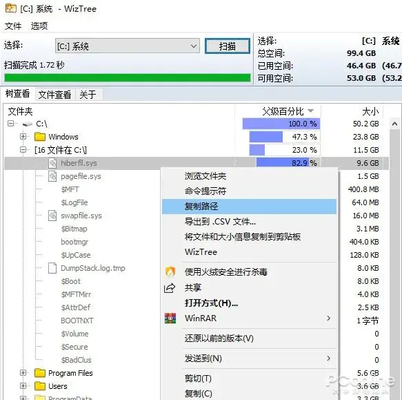 和同类软件相比,WizTree的最大看点就是它的速度。无论是内容单一的数据盘,还是结构复杂的系统盘,WizTree都能在2~3秒内完成分析。分析完成后,会用色条标识好每一组文件夹的体积,色条越长(百分比越大),代表体积越大。