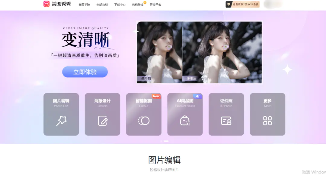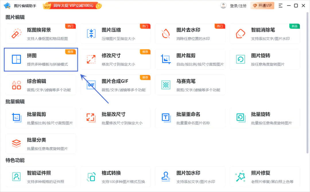 首先打开软件首页,选择“图片编辑”下的“拼图”功能;