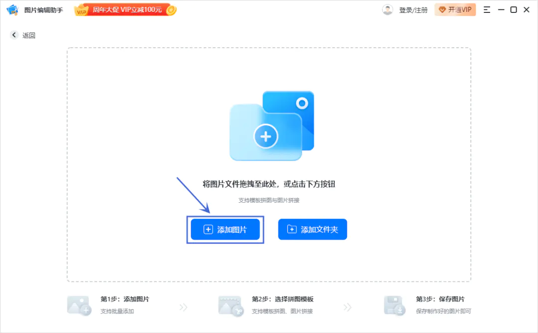 点击“添加图片”按钮上传需要拼图的图片,进入图片拼图页面;