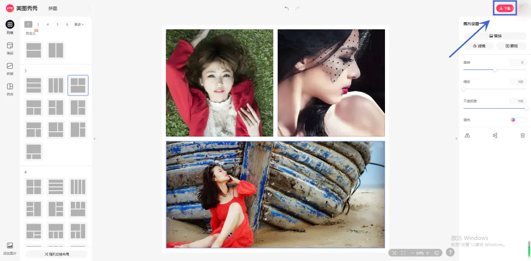 美图秀秀部分网格模板是免费的,可以选择使用,制作好的图片点击下载即可。