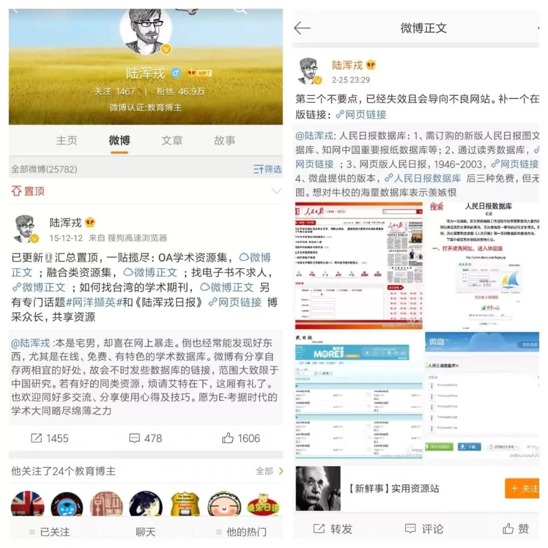 这是一位在微博上主要搜集整理开放性的数据库、免费在线资源、古籍、地图、老照片的教育博主。