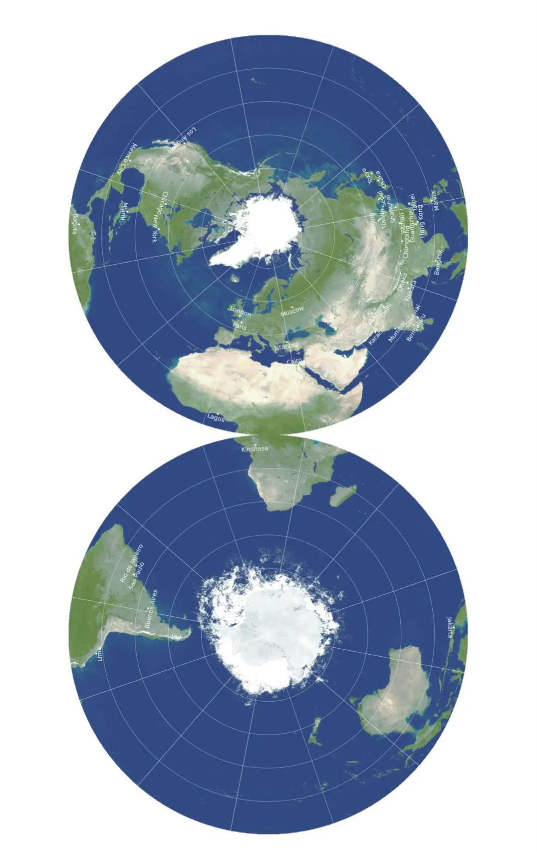 2021年2月,来自普林斯顿大学和德雷塞尔大学的J. Richard Gott、Robert Vanderbei、David Goldberg利用新双面投影技术绘制了“更优质地球平面地图”,类似中国的竖版地图,他们也采用纬线分割的方式,把地球分成两半,得到一个双面圆。
