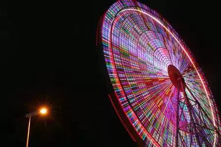 摩天轮高达112.5米,白天乘坐可以俯瞰大阪海滨风光。夜晚,彩灯点缀下的大摩天轮更是充满了浪漫情调。