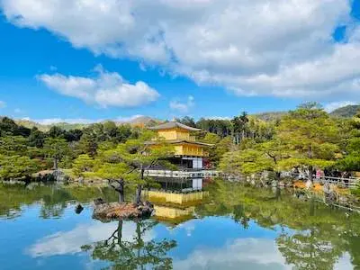 池畔的红叶和金色殿宇,与凋落在镜湖上的落叶和金阁寺的倒影交相辉映,炫目且雅致。