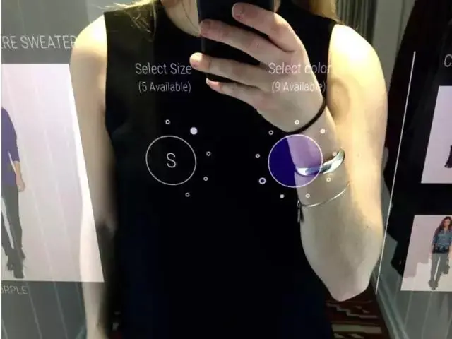 这面镜子也会对试穿者推荐其它服饰,这可能对增加销量有一些帮助。
