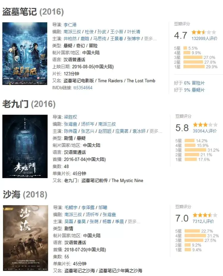 相反,南派三叔的新作,网剧《沙海》反倒逆流而上,相比于同一IP改编的《盗墓笔记》与《老九门》,从《盗墓笔记》的豆瓣评分4.7,到《老九门》的5.8,再到《沙海》的7.0,该剧在评分上已经领先“前辈”太多,在时下“品多不精”的市场险胜一筹。