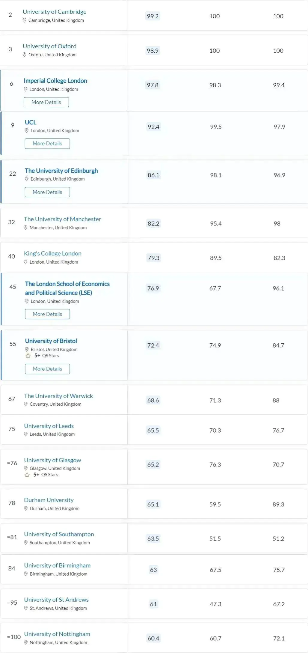 其中值得一提的是,去年的114位杀回前百的诺丁汉大学,从去年排名92涨到78的杜伦大学和今年第75名的利兹。