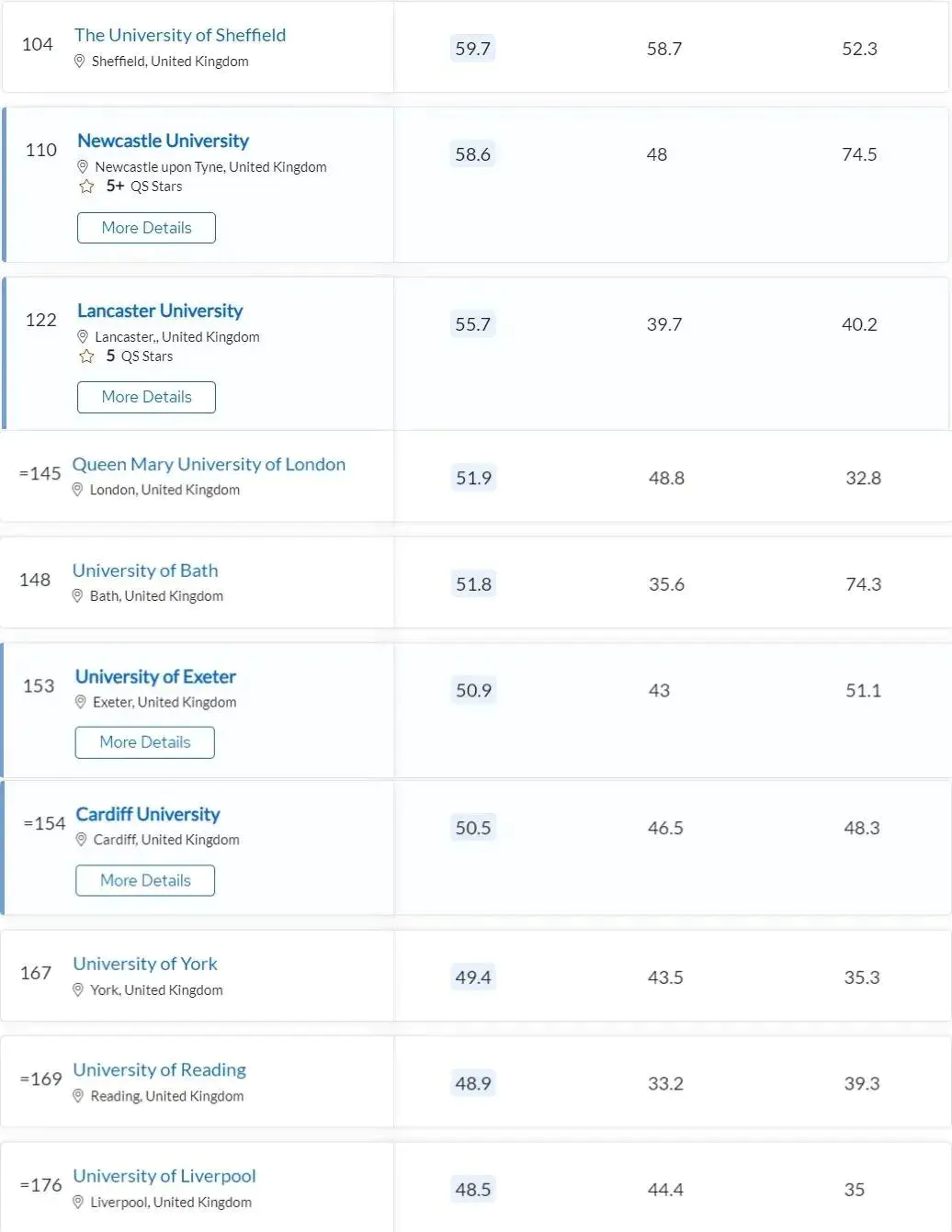 其中兰卡斯特大学(上涨22位),巴斯大学(上涨31位),卡迪夫大学(上涨12位),埃克塞特大学(上涨10位)和利物浦大学(上涨14)也都有明显的排名提升。