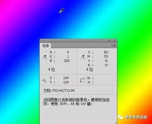 3、选择吸管工具(I)在图像上随意吸取,大家会发现在信息面板中RGB选项中的颜色在随时发生变化,如将吸管放置蓝色上,大家会看到RG颜色比较小,但B的值比较大。如下图所示: