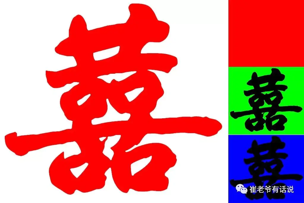 由于文件中的喜字为红色,所以显示器读取时在文字区域重点开红色光,绿色和蓝色在文字区域没有开光,又由于图像为白底,右侧图中的三个底图颜色全部打开(255+255+255=白色、0+0+0=黑色)。