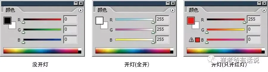 对于单独的R或G或B而言,当数值为0的时候颜色rgb值,代表这个颜色不发光;如果为255,则该颜色为最高亮度。这就好像调光台灯一样,数字0就等于把灯关了,数字255就等于把调光旋钮开到最大。