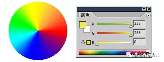 就需要把选色框向最黄色的方向移动,同时也逐渐远离最蓝色。当达到圆环黄色部分的边缘时,就是最黄色,同时我们离最蓝色也就最远了。由此得出,黄色=白色-蓝色”。为什么不是白色+黄色呢?因为蓝色是原色光,要以原色光的调整为准。因此,最黄色的数值是255,255,0。
