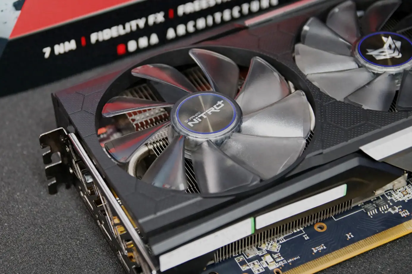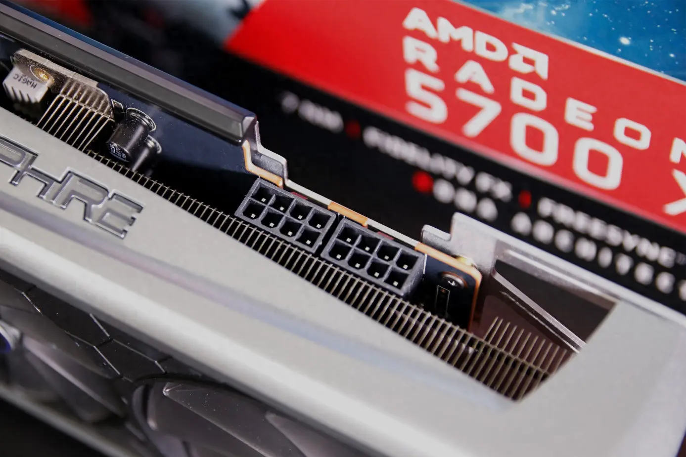 此外,RX 5700 XT也是用上了先进的7nm制程,这使得性能超越上一代同时,能耗上也有降低。不过为了保证显卡的性能输出,蓝宝石还是为这张显卡配置了双8-pin供电。