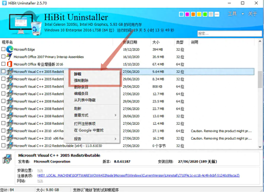这是我们最常使用的功能,就是常规的卸载以及清理残留信息。要是遇上顽固的软件无法进行常规卸载,那么可以使用强制卸载电脑管家离线安装包,这样就会把软件的所有文件和和数据强制删除。
