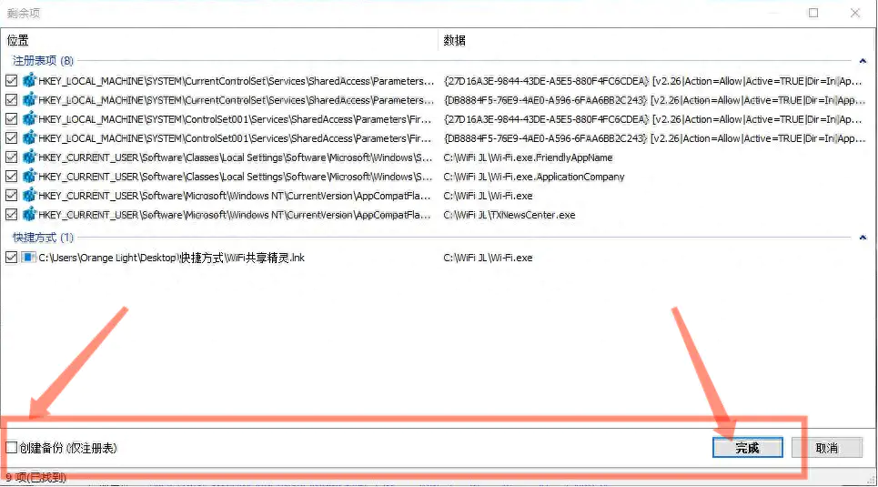 HiBit Uninstaller会自动扫描残留信息电脑管家离线安装包,扫描完如果需要备份这些文件,就勾选一下【创建备份】,这样下次安装可以还原备份的数据。点击完成即可完成残留文件和注册表的清理。